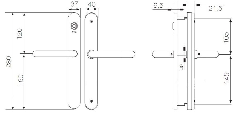 U shaped lever. Satin stainless steel finish. Door thickness 40-50mm.