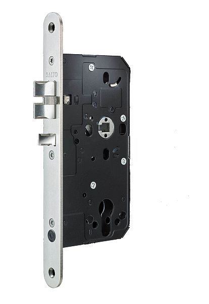 SALTO DIN Mortise Deadlatch, anti friction. 60mm backset. 72mm Spindle to cylinder centres. Lever and cylinder (if fitted) retracts latch (panic/escape function). Stainless steel finish. 24mm forend and strike with radius ends. Reversible handing. Use 1 x our product code MANINTSALTO Intumescent for FD30/60 on Salto XS4 & XS4 Mini & 2 for XS4 ONE.